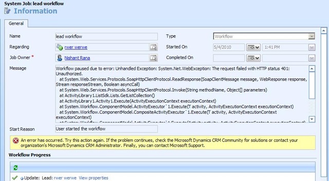 "An error has occurred. Try this action again. If the problem continues, check the Microsoft Dynamics CRM Community for solutions or contact your organization’s Microsoft Dynamics CRM Administrator. Finally, you can contact Microsoft Support."