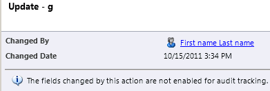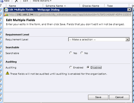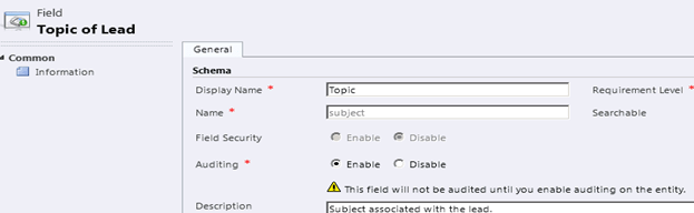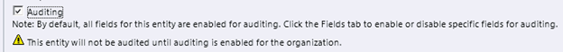 There we can see that it is already enabled for auditing. However below we have warning icon that tells us that “This field will not be audited until you enable audition on the entity”.
