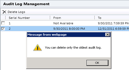 Here each audit log stores audit records for one calendar quarter. If we try to delete log with serial number 2, we get the following message