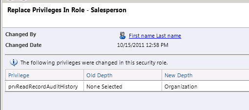 I have enabled auditing on Security Roles entity, and now I go and change the Access Level of Sales Person role on View Audit History privilege. So that should be tracked now…