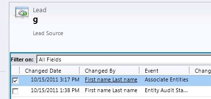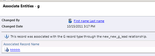 Let us create a new N-N relationship between lead entity and one of our custom entities (name G), and then associate there records. We can see one entry in our Audit History for that event.