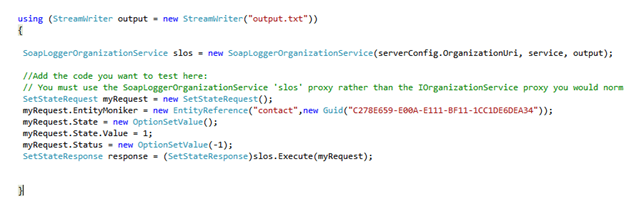 Using that tool we can write our code in C# and it captures the corresponding SOAP Request and Response for it in a file named Output.txt, which we can then use in our JavaScript.