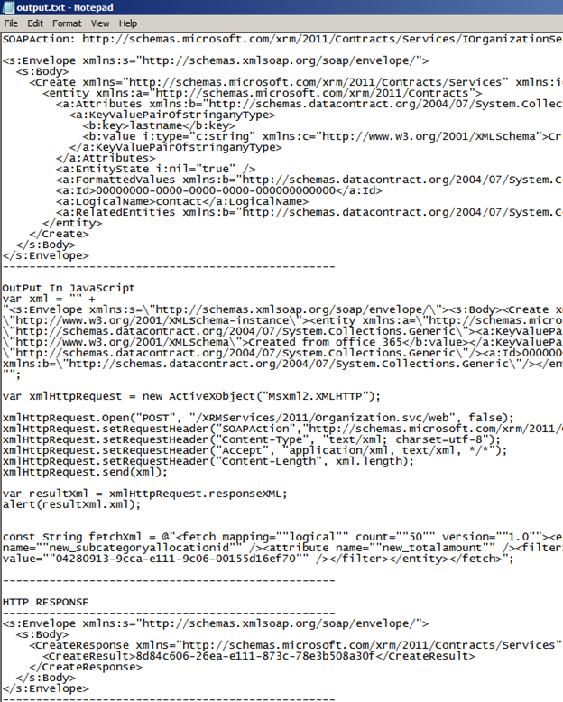 Using that tool we can write our code in C# and and it captures the corresponding SOAP Request and Response for it in a file named Output.txt. I have updated the code so that it formats the SoapRequest in JavaScript which than can be used as web resource in our solution. (It works with Office 365 as well).