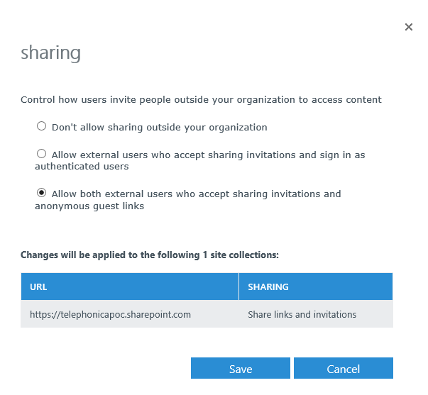 Select the Sharing option for the selected site collection in the SharePoint administration page