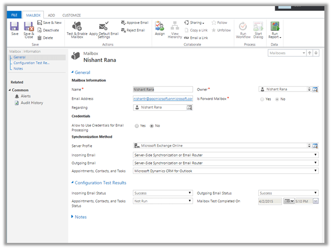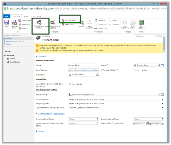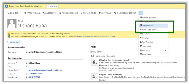 Open the system user record and click on Open Mailbox to open user’s mail box.