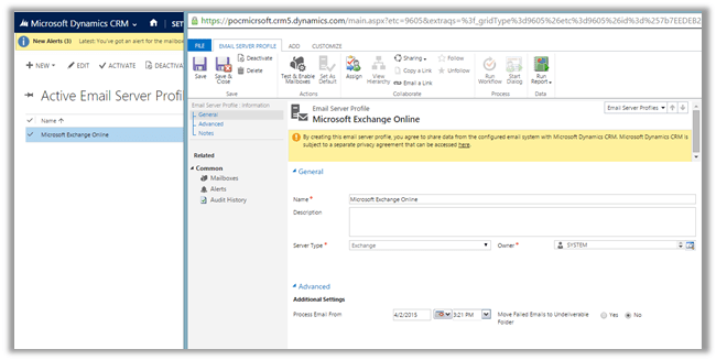 Select and open the already existing Email Server Profile i.e. Microsoft Exchange Profile.