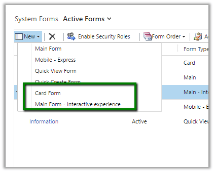 “Enable for interactive experience” option will auto create 2 new forms of type Card and Main – interactive experience.