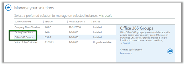 Go to CRM Admin Center à Solutions à Install the Office 365 Groups Solution