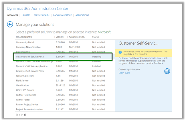 Once trial is set up successfully, open the admin center for Dynamics 365 and select Applications and click on Manage to configure the portal.