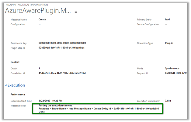 We can see the execute method being called from Azure Service bus on create of Lead record.