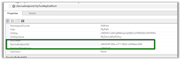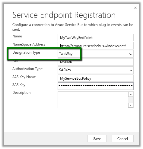 First let us update the Service Endpoint Registration, change the designation type to TwoWay, it would also ask to enter the SAS Key. Copy it from Azure and paste it.