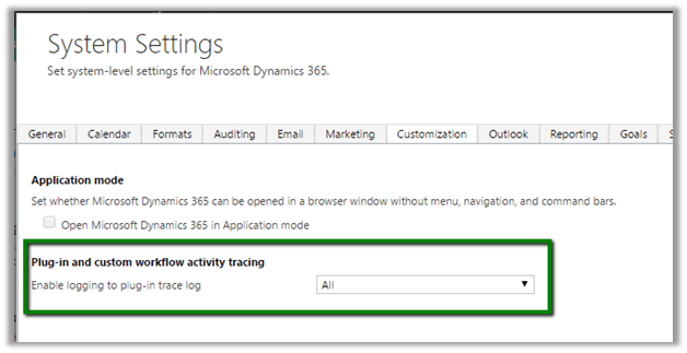 As we are using trace service to log the response, set All for Enable logging to plugin-trace log option from Administration – System Setting – Customization.