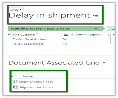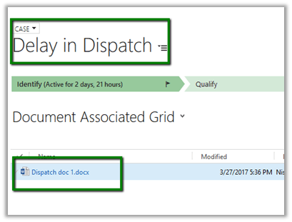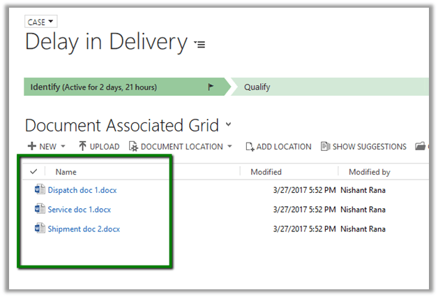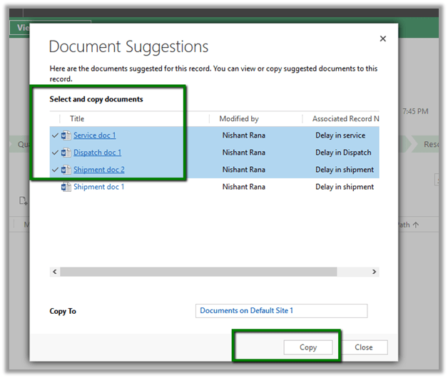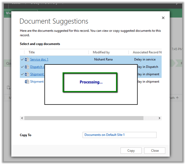 A dialog opens which list all the documents that are associated to the case records similar to the Delay in Delivery record i.e. all the remaining case records having delay keyword in its title.