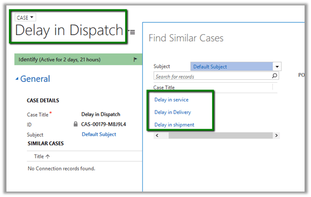 Now as we already have Similar Record Suggestions configured for Case entity, for a case record with Delay keyword in its title we get the below suggestions