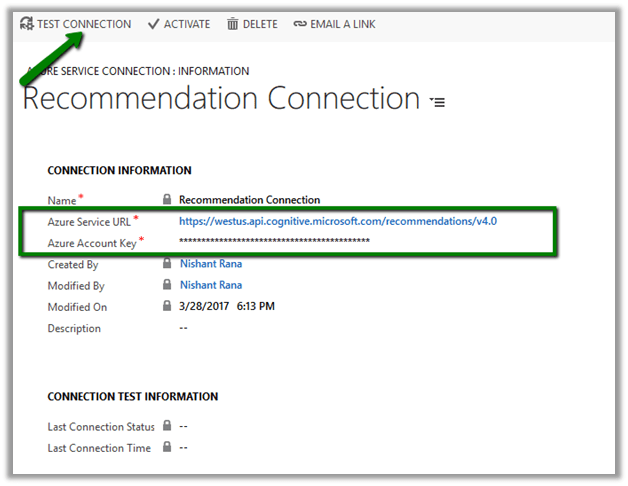 Specify the value for the URL and Key we had noted down earlier, save the record and click on Test Connection to test the connection.