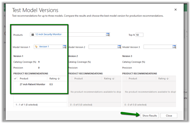 Pop up opens wherein we can select the Products and model version and click on Show Result to see what are the product recommendations.