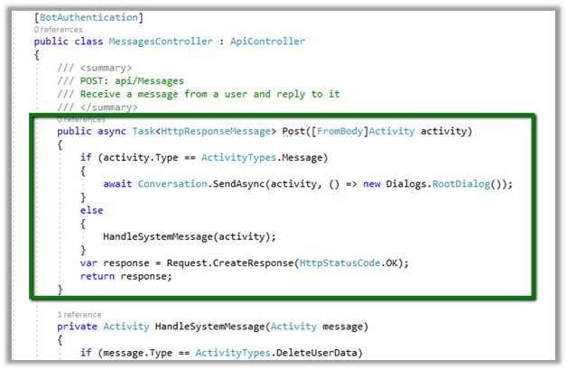 The class has the Post method which handles the message sent by the user/client termed as Activity. The Post method handles the Activity of type Message.