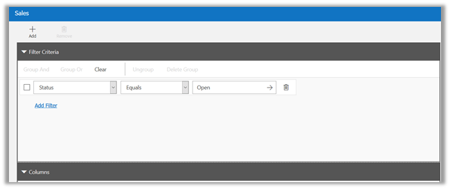 Filter Criteria, Sorting and Column Properties can be defined in the same designer canvas without having to open a new window for that.