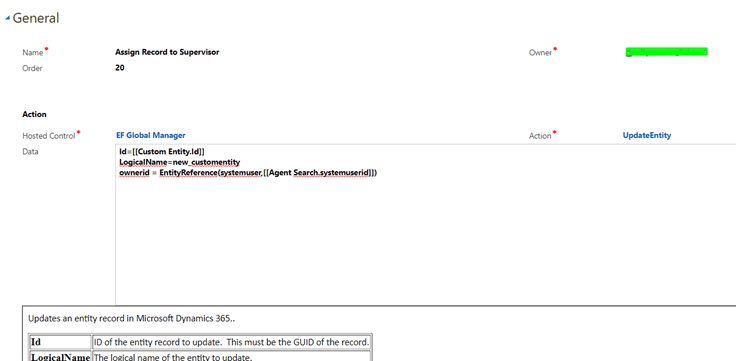 Scenario: A CRM custom entity record get created in Unified Service Desk when an agent receives a customer call. And if agent transfer customer call to their supervisor, same entity record should also get assigned to supervisor. Below are the details of the action call I created.