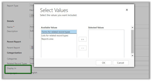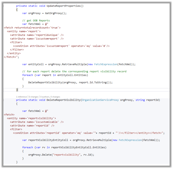 In our case, we simply updated the Display In property for all the OOB reports. Below is the sample code that we used. Basically, every report can have 0 or more (max 3) related Report Visibility records associated to it. (i.e. for forms, lists or reports area). In the below code we have looped through all the OOB reports and deleted all the associated ReportVisibility records for that report.