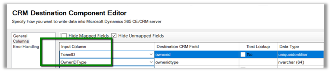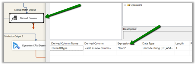 Then we added Derived Column task to add one more column for specifying ownerid type field to be used in CRM Destination Component while mapping. We defined the field type as string and hardcoded the value as “team”.