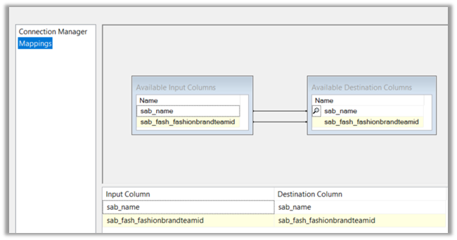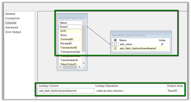 Now the most important part, the columns properties. Here we defined the mapping between the Brand field of the SQL View and name field of the Brand Entity of CRM and selected the teamid field as the lookup column whose value we would like to fetch as shown below.