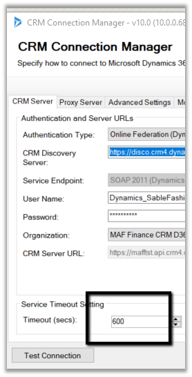 One way to get around this error is to increase the Timeout (secs) in the Service Timeout Setting of CRM Connection Manager.
