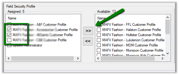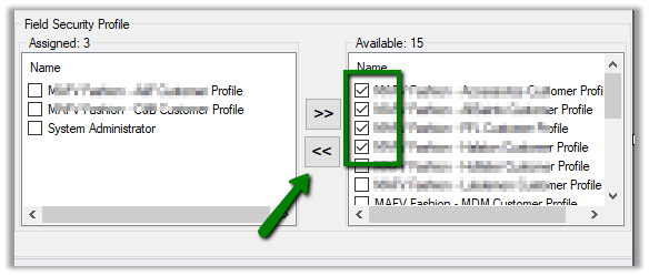 - Clicking on the button labelled “<<“, adds a user to the selected Field Security Profile.