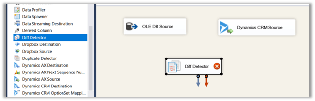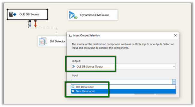 Connect the OLE DB Source to Diff Detector and specify the input as the New Data Input as this is the new data that is being entered, the other option is Old Data. Here the Dynamics CRM Source will be used and set as Old Data that is already existing against which the new data needs to be compared.