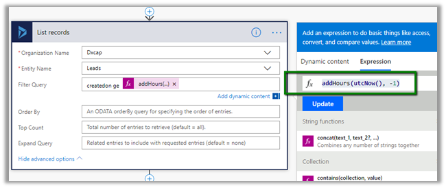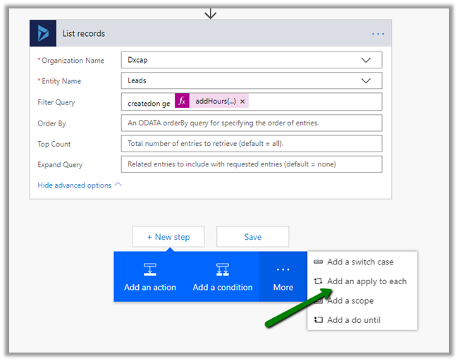 For List records action, select the organization in the Organization Name, Leads for the Entity Name and for filter query specify “createdon ge addHours(utcNow(), -1)“: i.e. lead records created in last one hour as shown below
