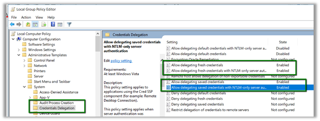 - Allow delegating fresh credentials with NTML – Only server authentication