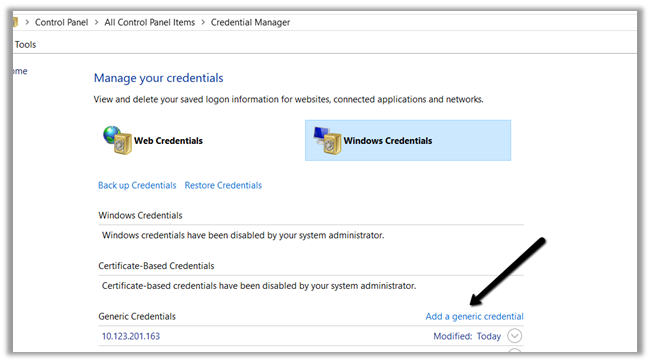 Then open Credential Manager from the command prompt and a windows credential.
