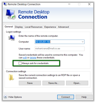Recently even after saving the credentials in connection settings to an RDP file, every time we were opening it, it was asking us to enter the password.