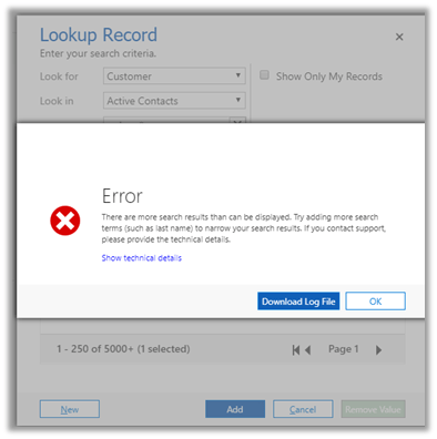 “There are more search results than can be displayed. Try adding more search terms (such as last name) to narrow your search results. If you contact support, please provide the technical details”