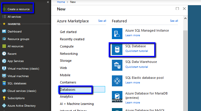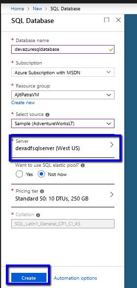 - Make sure the Azure SQL Server that we just created is selected as Server while creating Azure SQL Database. Fill the mandatory fields and click Create.