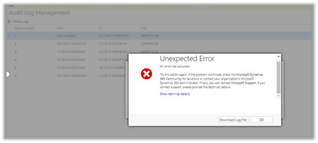 We had around 200 GB of Audit Log data in our Production Environment (Online), but while trying to delete it through Audit Log Management resulted into unexpected error.