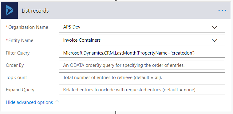 Today we got a requirement to fetch all the records that are created in the last month by using MS Flow. We can do this by using “Dynamics 365 List records” action and we have to provide OData filter query for this action. I tried to use the same “last-month” operator that we use in the fetch xml. But this will not work for OData query. We need to use “LastMonth” function for this as defined in this link. The below are the examples to use these date functions.