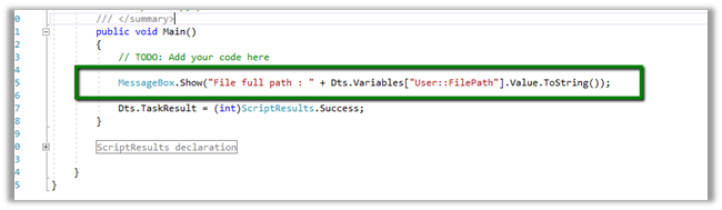 Here we have set the FilePath variable as the ReadOnlyVariables that we will read within the Script Task code and show it in the Message Box.