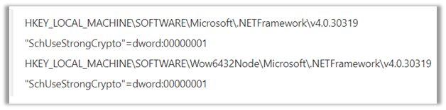 To get it working as suggested by Microsoft we had to update the registry and add the following key – “SchUseStrongCrpto”