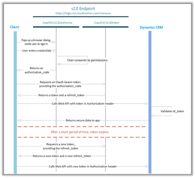 Trusted by protected resource (Dynamics CRM) to issue Access Tokens to Clients, which the client can then use to access protected resource (Web API). Azure Active Directory (Azure AD) in this case. Resource Owner authenticates to the Authorization server, so the credentials are not exposed to the client. |
