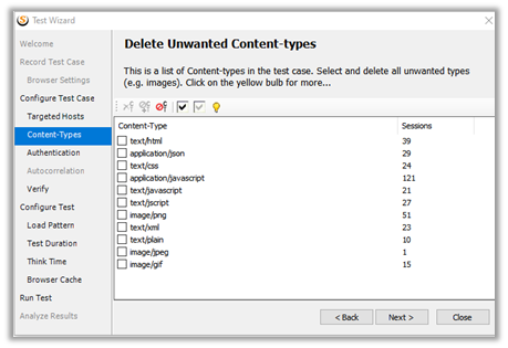 Next we are presented with the option of selecting the content types to include in the test case.
