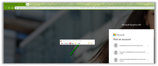 During recording we can specify various transaction, or basically events that we are capturing inside the recording toolbar. Here clicking on Start Recording will open Chrome for us with Dynamics CRM URL specified. We have specified “Login” in the transaction box to capture set of actions specific to login.