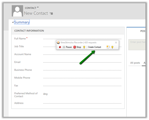 After login, we want to capture creation of Contact Create, we can specify the same in Recorder tool bar and continue creating the contact record in CRM.
