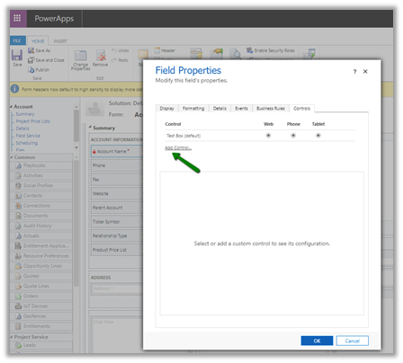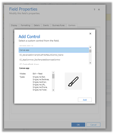 To create the canvas app custom control, select the controls tab in the Field Properties dialog, and click on Add Control.