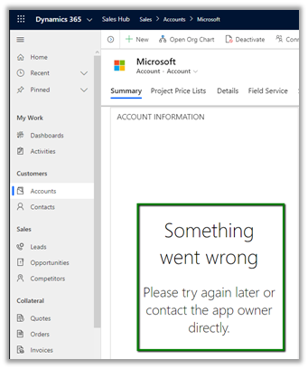 The other Dynamics CRM User say poweruser2 will get the below error message when they open the same form if the app is not shared with them.