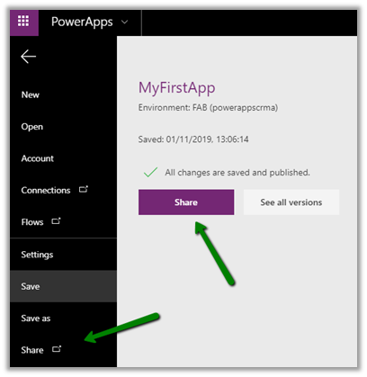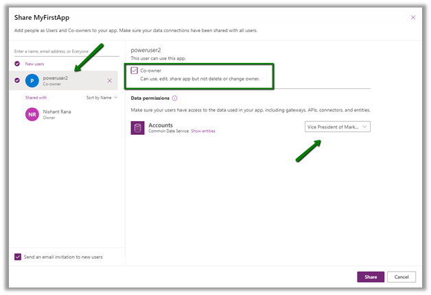The app can be shared with specific users, security groups or everyone within the organization. The users should have appropriate security roles to access the entities and also appropriate permissions on the cloud services that are being used as part of the canvas app.