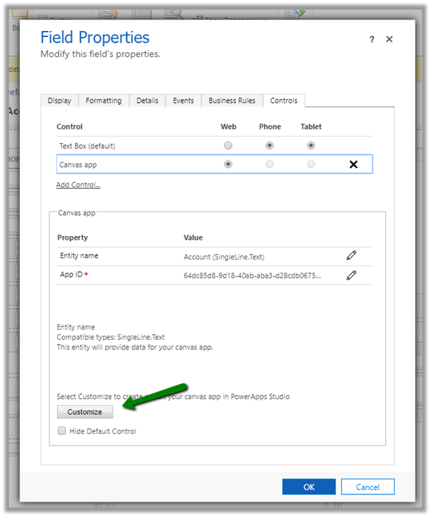 To Edit the canvas form control, we need to follow the same steps, open the field properties, controls tab and click on Customize