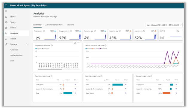Power Virtual Agent also comes with analytics to show key performance indicators for different topics.