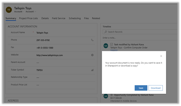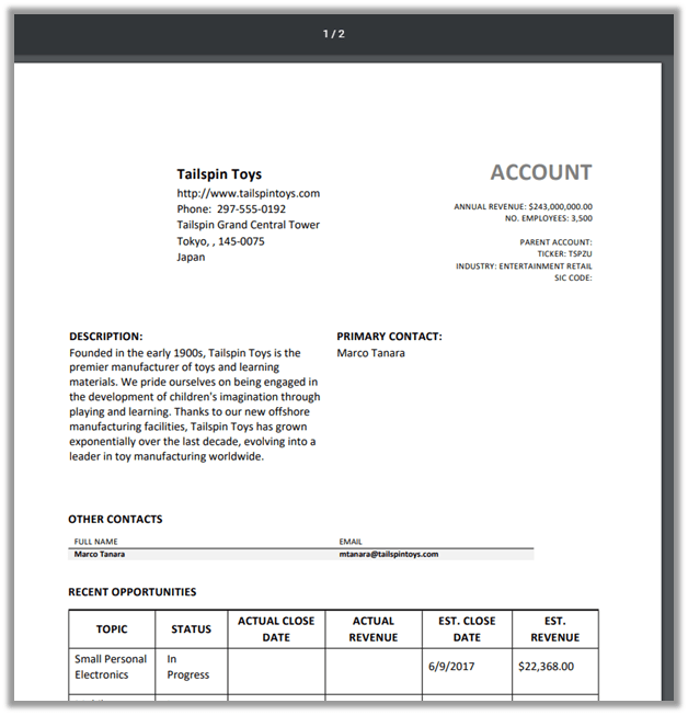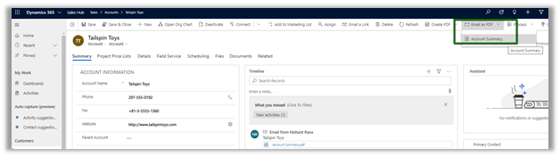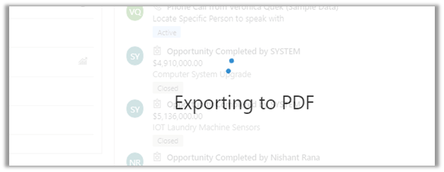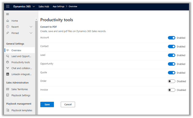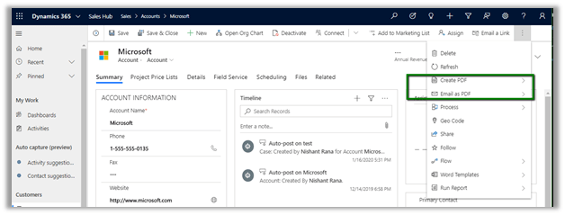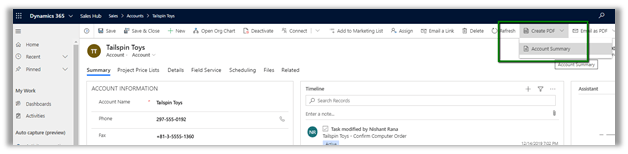 The PDF generation capability has been added to Dynamics 365 Sales for the following entities: Lead, Contact, Account, Opportunity, Quote, Order and Invoice.
