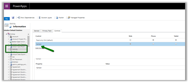 Open the Activity entity for Customization and add the Kanban control and publish the changes.